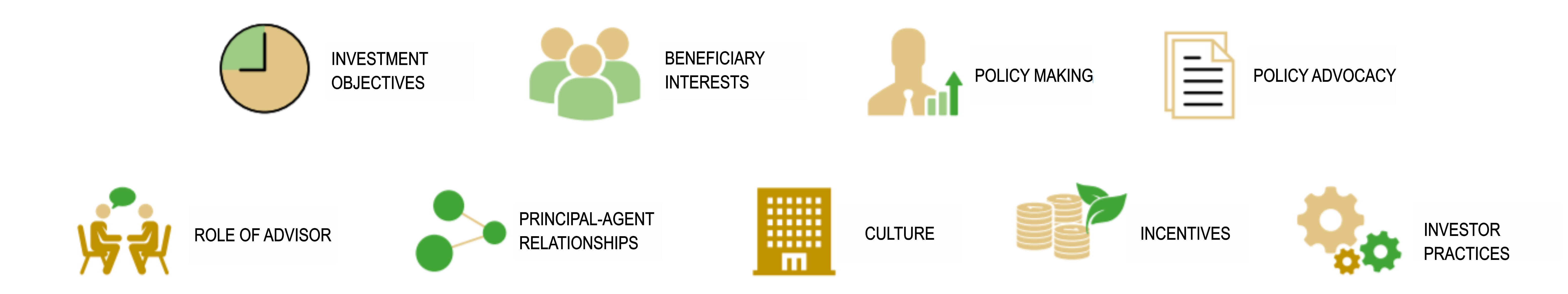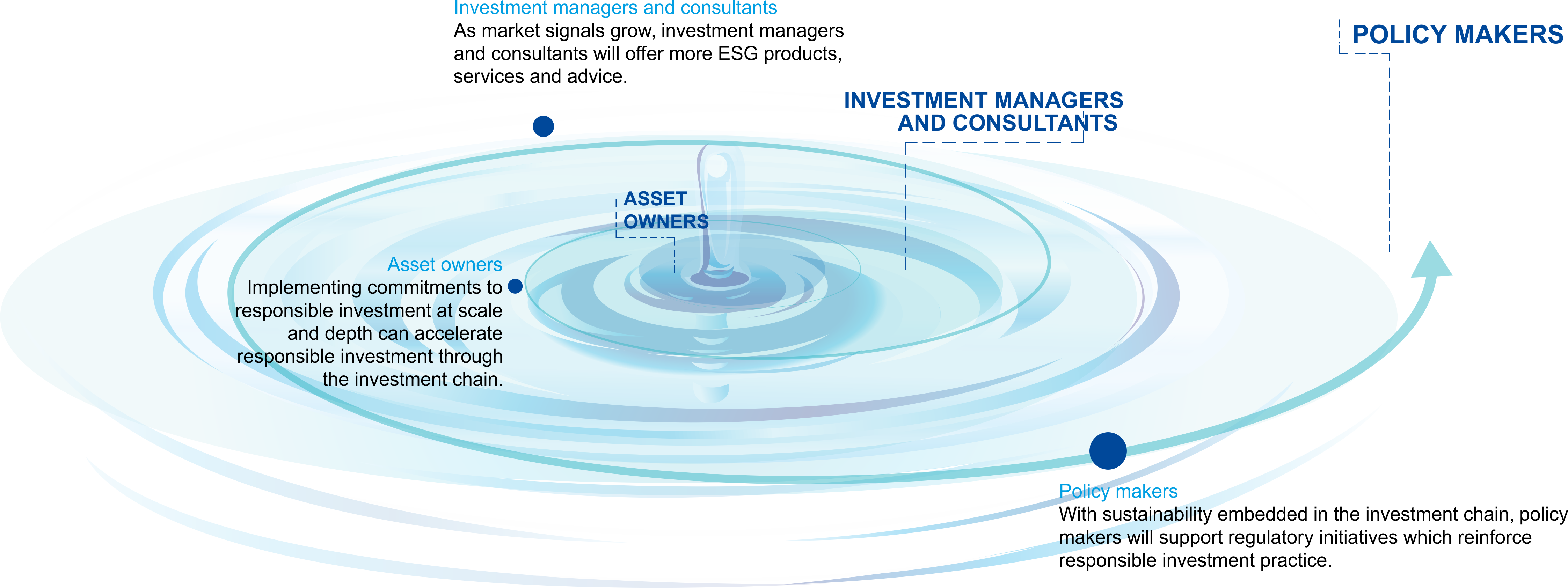 The financial system should enable individuals, organisations and governments to reliably store their assets for future use, and should support sustainable economic development by making those assets available for responsible, productive use by others in the meantime. We will work on the parts of the system where we can make a difference – beneficiaries; investors; their advisors and service providers; companies and issuers; securities exchanges; regulators – and will monitor environmental, social, technological, economic and political trends that will continue to reshape the financial system as we work.